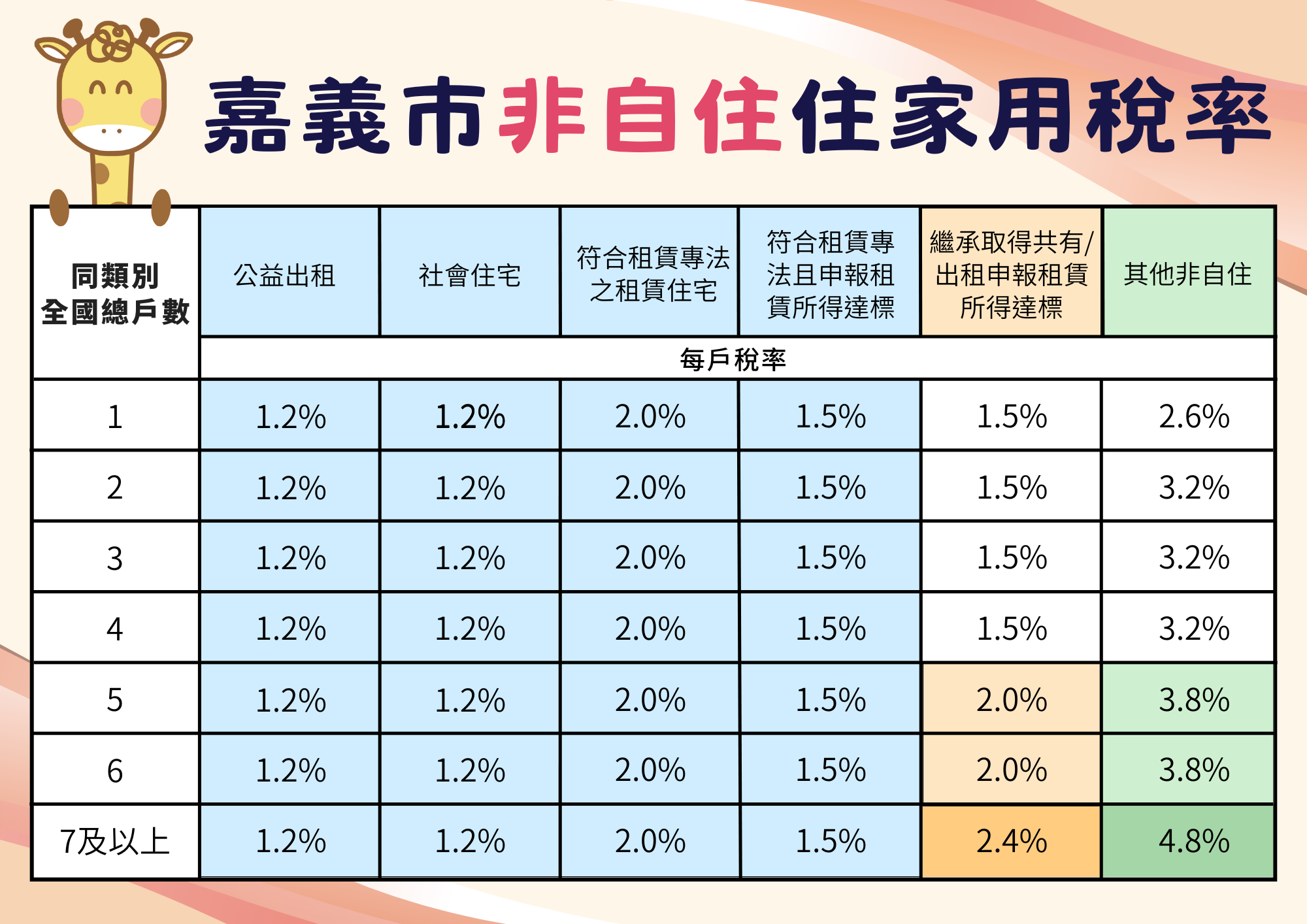 嘉義市政府財政稅務局表示,因房屋稅2.0新制上路,近來接獲不少持有多間房屋的屋主來電詢問,非常擔心今年5月要繳的房屋稅是不是會暴增,該局說明房屋如出租使用且符合相關資格規定(參考下方圖片),房屋稅率可能不增反降!