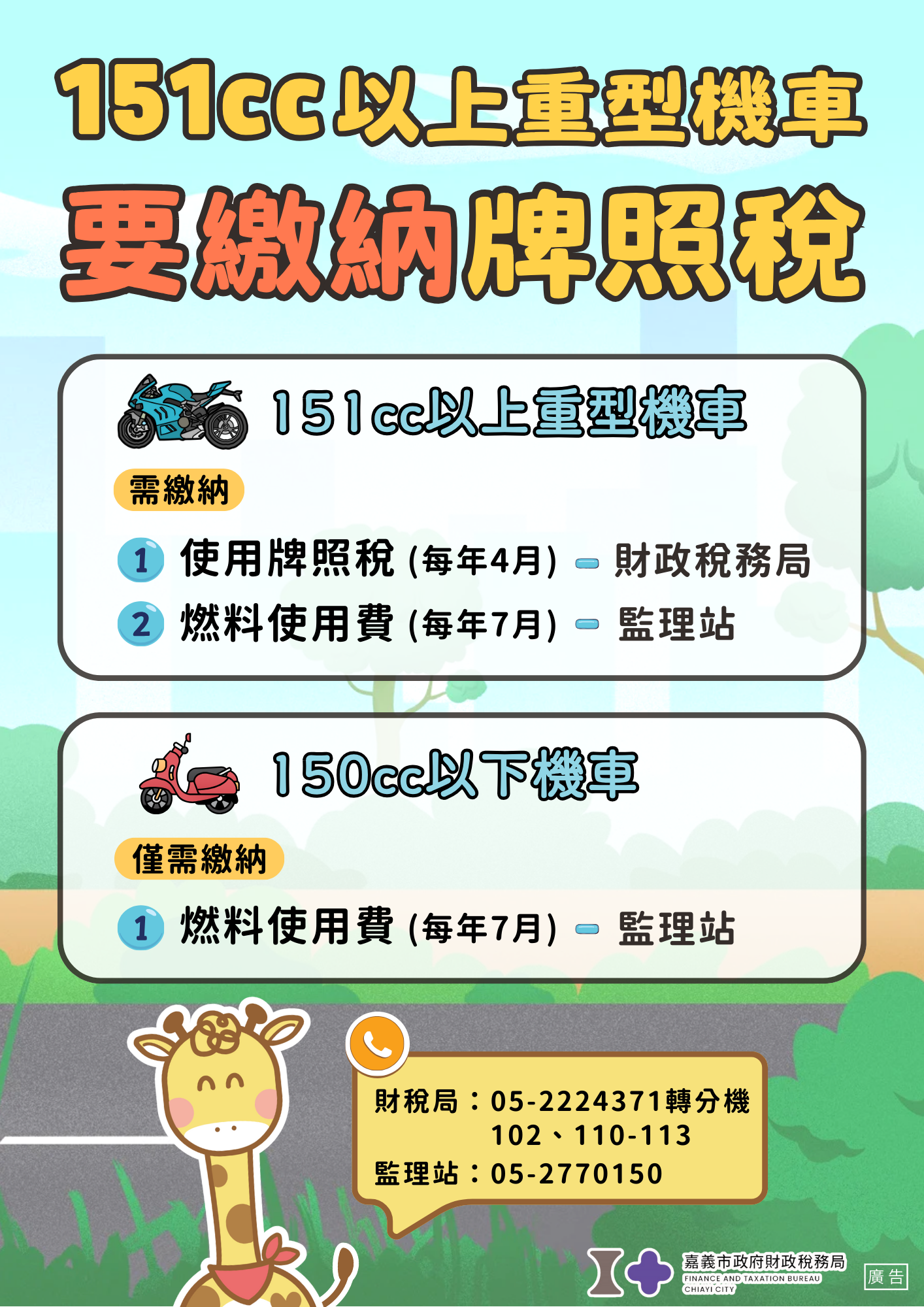 該局說明,需要繳納使用牌照稅的「重型機車」係指汽缸總排氣量151cc以上,150cc以下機車無需繳納使用牌照稅,僅需繳納燃料使用費(7月開徵,由公路監理機關負責)。另外完全以電能為動力的機車,免徵使用牌照稅至114年12月31日止。
