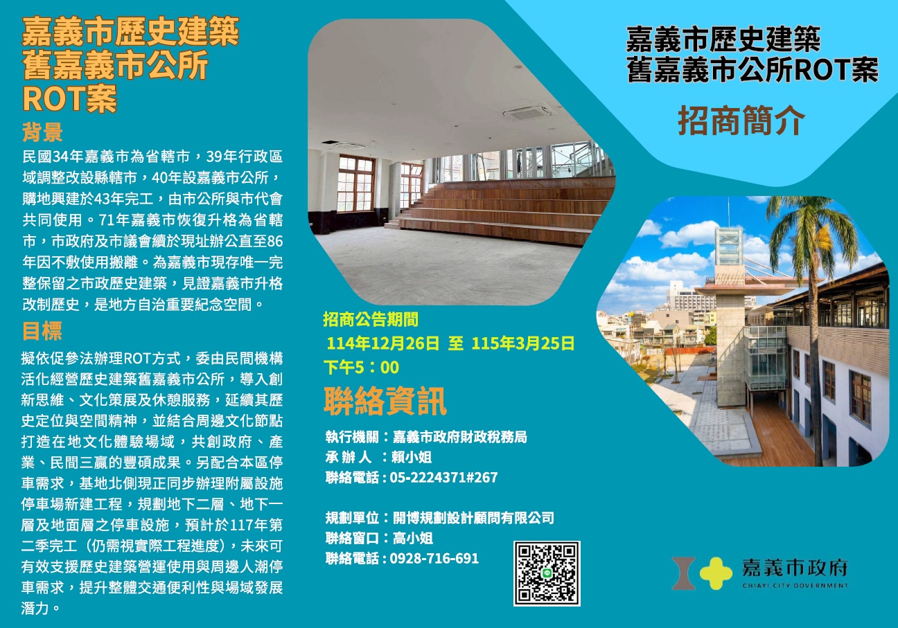 嘉義市政府財政稅務局辦理「嘉義市歷史建築舊嘉義市公所ROT案」,以民間廠商投資裝修並營運維管,期滿後歸還政府之參與方式辦理,自去年12月26日公告招商,期間至115年3月25日下午5時申請截止,將引進大型零售、餐飲、商業設施及展演、文教消費商機,歡迎投資者踴躍參與。本案營運含裝修年期共8年,如經營績效評定達良好等級,可於契約屆滿前申請優先定約,並以4年為限,歡迎民間企業共同打造最具前景的舊市公所垂楊路商圈。