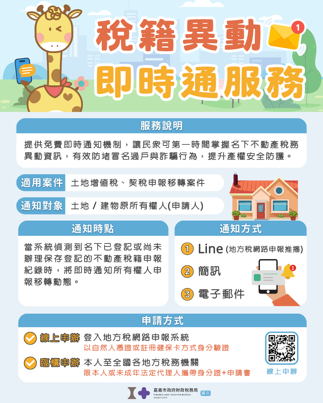 該局說明,「稅籍異動即時通」服務涵蓋範圍包括已登記及尚未辦理保存登記的不動產,當系統偵測到與名下不動產相關的稅籍申報紀錄時,將依申請人選擇之通知方式,以簡訊、電子郵件或財政部地方稅網路申報作業官方LINE推播通知,協助民眾掌握重要資訊,預防因詐騙、冒用或竊盜等情形,導致房屋或土地在不知情下遭盜賣或移轉。