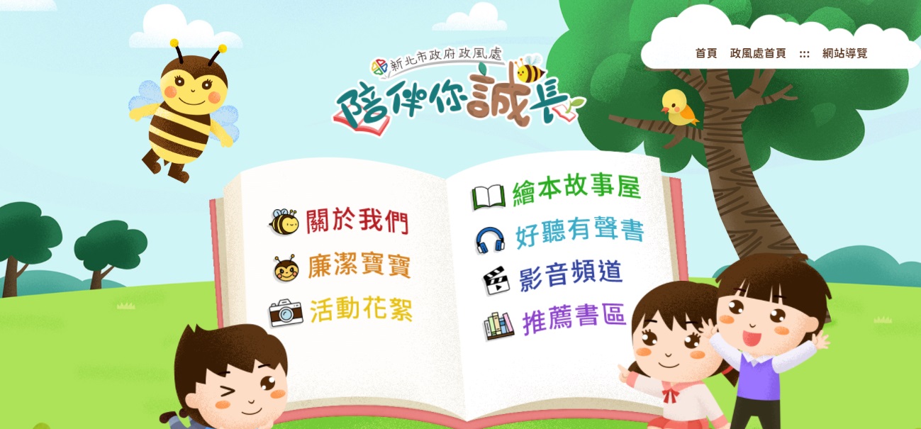 新北市政府政風處建置「陪伴你誠長網站」,網站內容包括廉政故事集、廉政故事有聲書、廉政故事屋影片等品材教材,歡迎各位大小朋友閱讀及瀏覽。