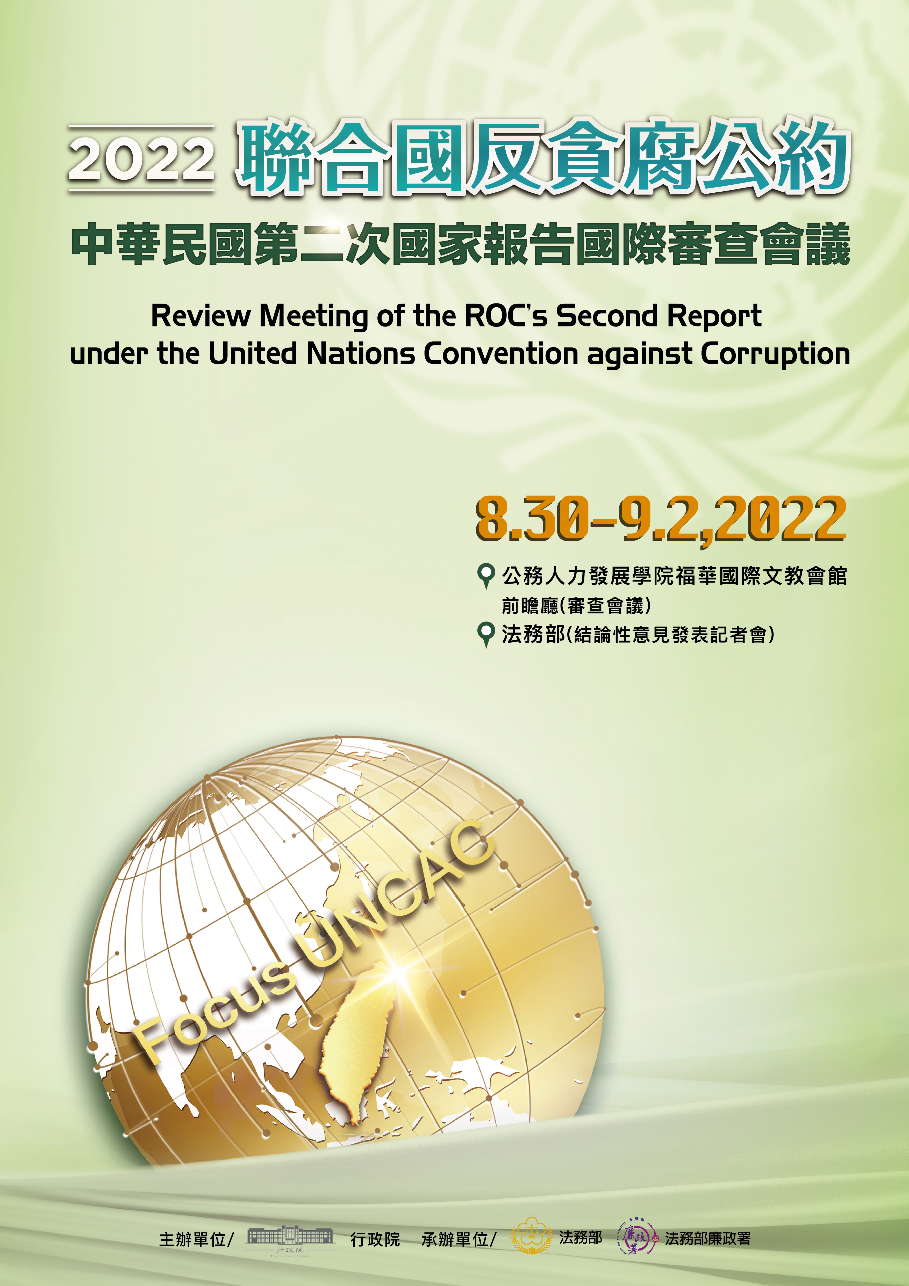 今年8月30日至9月2日,臺灣將舉辦第二次國家報告國際審查會議,邀請長期投入國際組織或非政府組織,在反貪腐領域深耕並具影響力之5名專家,來臺進行實地審查,針對臺灣落實公約的執行情形,與政府機關代表進行深入對談,臺灣也將結合政府、企業與民間的社會力量,讓國際更瞭解臺灣在捍衛民主與反貪腐普世價值之具體作為與決心,相信將會是一場相當精采之盛會。