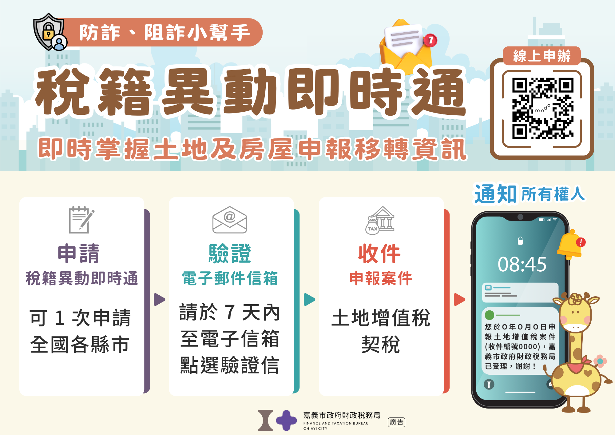 為預防不動產詐騙案件發生,可預先申辦本項服務,未來有土地或房屋移轉申報土地增值稅或契稅時,將以手機簡訊、電子郵件或地方稅網路申報官方LINE推播通知原所有權人,在不動產過戶前,即時掌握土地及房屋申報移轉資訊。(可於本市1次申請全國各縣市,連江縣除外)